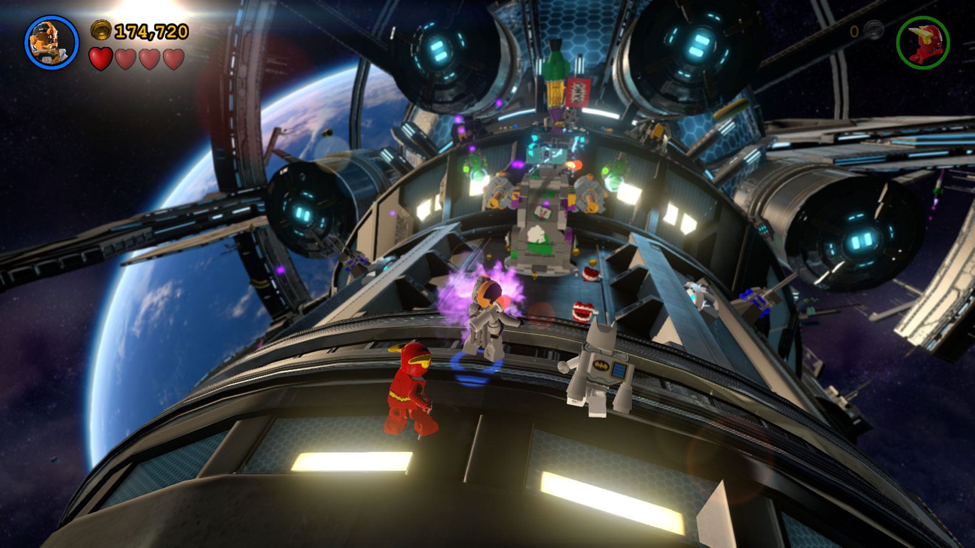 محیط های مختلفی در بازی وجود دارد که همه بر اساس مکان های دنیای DC Comics هستند. چندین مرکز برای قهرمانان در بازی وجود دارد مانند : غار مخفیگاه بتمن، "ماه" و تالار عدالت. در اینجا، بازیکن میتواند پازلها را برای یافتن، کسب یا باز کردن قفل «آجرهای طلا» یا «قابلیت های شخصیت بازی»، دسترسی به سطوح اصلی بازی و تکمیل ماموریتهای جانبی، کشف و تکمیل کند. همچنین ویژگیهای خاص دیگری مانند فعال کردن «آجرهای قرمز» و مشاهده «کیتهای کوچک» (که در سطوح جمعآوری شدهاند) وجود دارد. بازیکنان همچنین میتوانند شخصیت خود را با استفاده از قطعاتی از شخصیتهایی که قبلا باز کرده است و همچنین مجموعهای محدود از سلاحها ایجاد کنند.
