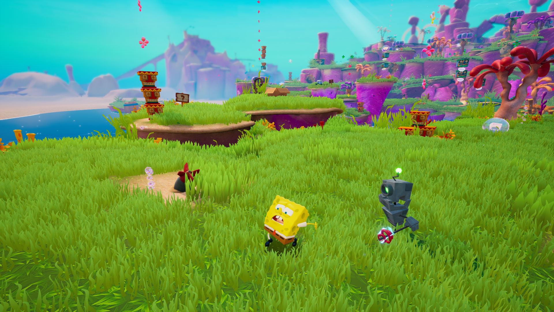بازی در جهانی فانتزی و تخیلی جریان دارد. از این رو به طبع چنین عنوانی نیازمند فضاسازی فانتزی و کودکانه است و در این زمینه نمیتواند از این بازی ایرادی گرفت. طراحی شخصیت های بازی، بافت گرافیکی محیط و ترکیب رنگ ها، همگی روحی کودکانه و شاد را در خود دارند و همین موضوع گشتن در این دنیای زیر آب را جذاب تر از قبل کرده است. ترکیب صداگذاری و فضاسازی بازی در مجموع و همان حس شادی و سرخوشی آشنا از تماشای انیمیشنهای خاطره انگیز باب اسفنجی را برای شما تداعی خواهد کرد.