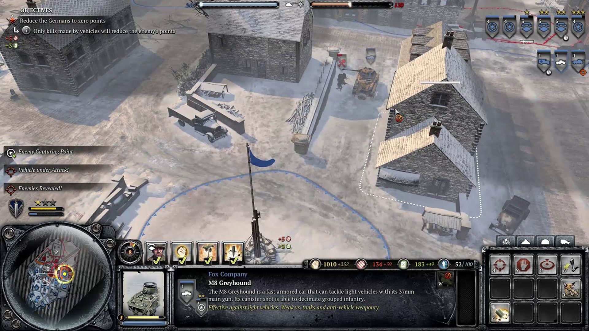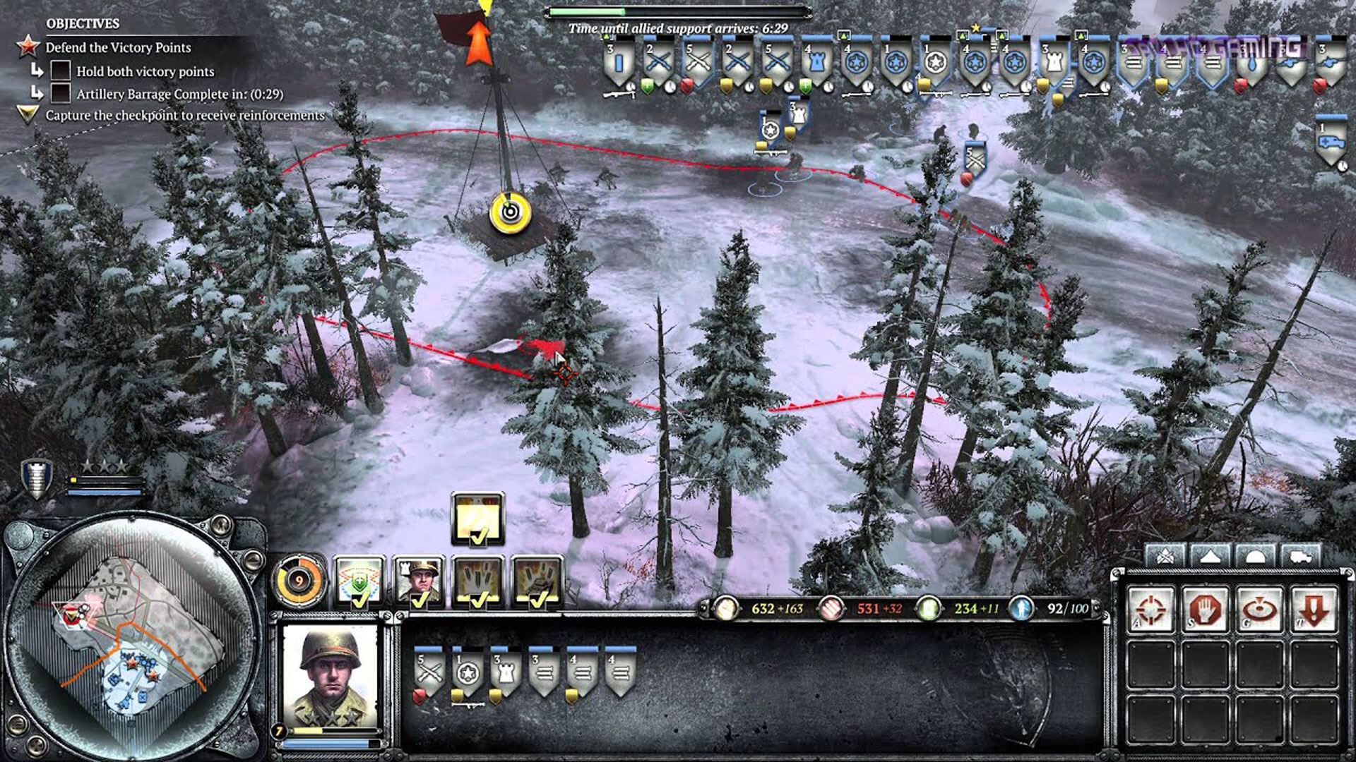اکثر ارتشها میتوانند برای افزایش درآمد سوخت یا مهمات از این نقاط، انبارهایی بسازند، اگرچه برخی از نقاط درآمد بالاتری از یک ماده تولید میکنند، اما نمیتوانند روی آنها انباری داشته باشند. به جای اینکه واحدهای سرباز در واقع در نقطه پرچمدار جمع شوند، در صورتی که واحدهای بازیکن در داخل یک منطقه خاص و بدون واحدهای دشمن در همان منطقه باشند، میتوان آن نقطه را تصرف کرد. اگر بازیکنان نقاط مختلف پرچمدار را در سراسر نقشه ثبت کنند، انباشت این منابع و اندازه ارتش بازیکن می تواند بسیار سریعتر باشد. برای اینکه یک بازیکن از مزایای یک نقطه تسخیر شده بهره مند شود، باید بخشی از یک منطقه پیوسته از قلمرو تصرف شده باشد، بنابراین اجازه می دهد یک زنجیره ناگسستنی ("خط تامین") متصل به ستاد مرکزی باشد. بنابراین، در صورتی که طرف مقابل قلمرویی را که نقاط متعلق به سایر بخشهای متحد در نقشه را جدا میکند ("قطع") کند، مصرف منابع محدود میشود. از نیروی انسانی برای ساخت واحدهای مشترک استفاده می شود و هر چه ارتش بازیکن بزرگتر شود، مقدار آن کاهش می یابد.