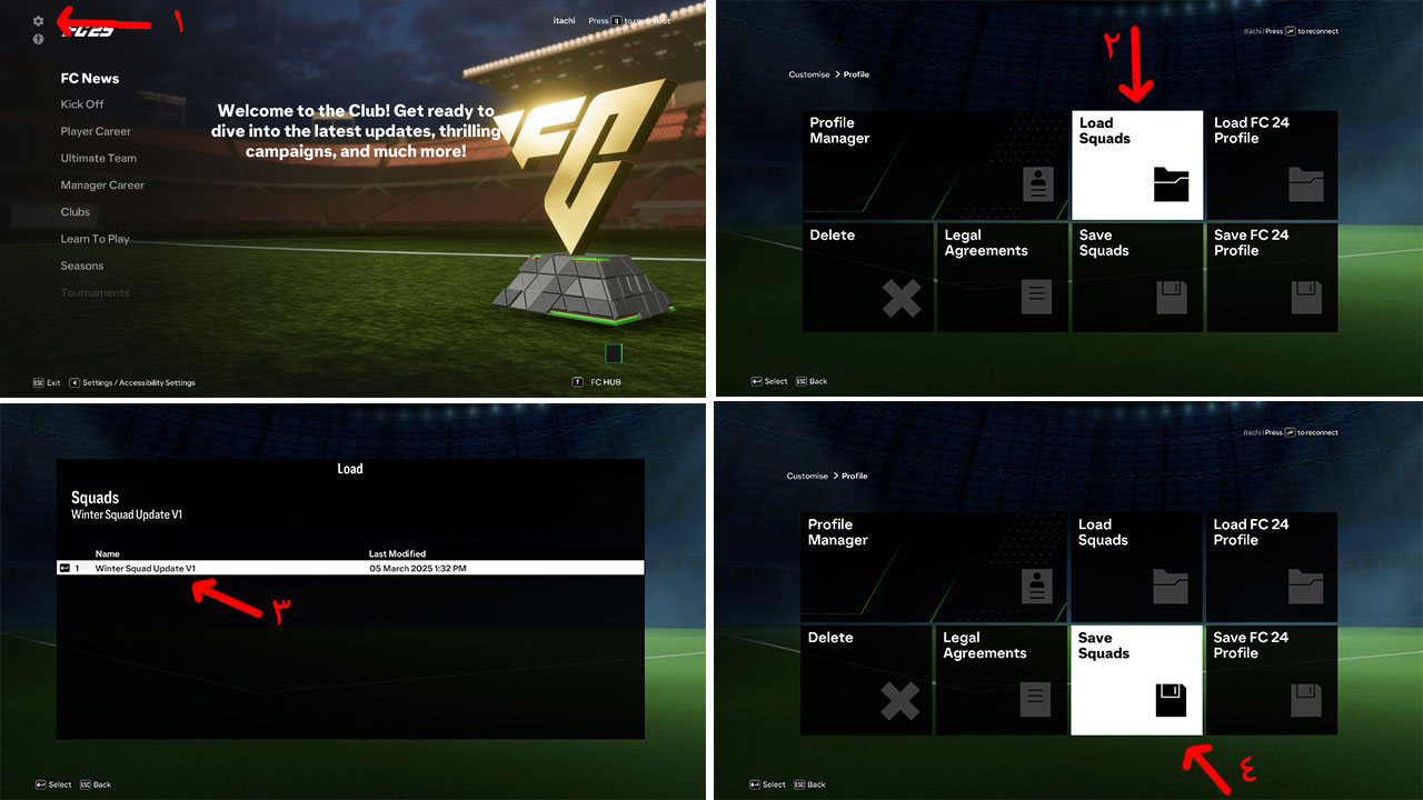 بعد از این کار به داخل بازی رفته از قسمت SETTING و PROFILE اسکواد مربوط به هر آپدیت را لود کنید