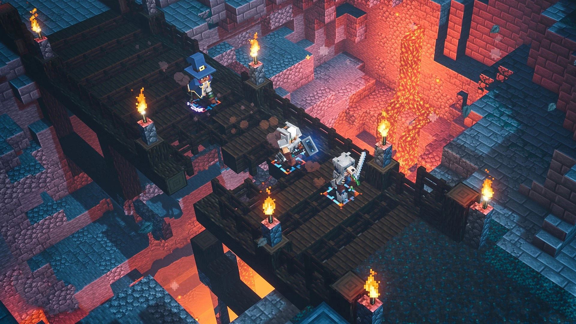 گیم پلی بازی Minecraft Dungeons در اوج سادگی، هیجانانگیز و جذاب است. کافی است دکمههای روی دسته را پشت سر هم بفشارید تا فنون رزمی روی دشمنان اجرا شوند و با استفاده از سلاحتان رسماً همه را به آن دنیا بفرستید. استفاده از تجهیزات مناسب اهمیت زیادی در طول بازی دارد و به فکر استفاده درست آنها باشید تا مبادا دشمن بر شما غلبه کند. ماینکرافت دانجنز ویژگی بازی تیمی را در اختیار شما قرار داده است. دوستی را همراه خود کنید و در سیاههای چال ترسناک به کشتن دشمنان تادندانمسلح بپردازید. گرافیک بازی بهصورت ایزومتریک طراحیشده است و شاید این سبک مطابق میل شما نباشد اما بعد از چند دقیقه میبینید که این بازی یک تابلوی نقاشی بسیار زیباست که در سبک خودش تجربهای فوقالعاده را ارائه میدهد و ساعتهای مفرحی برای شما میسازد.