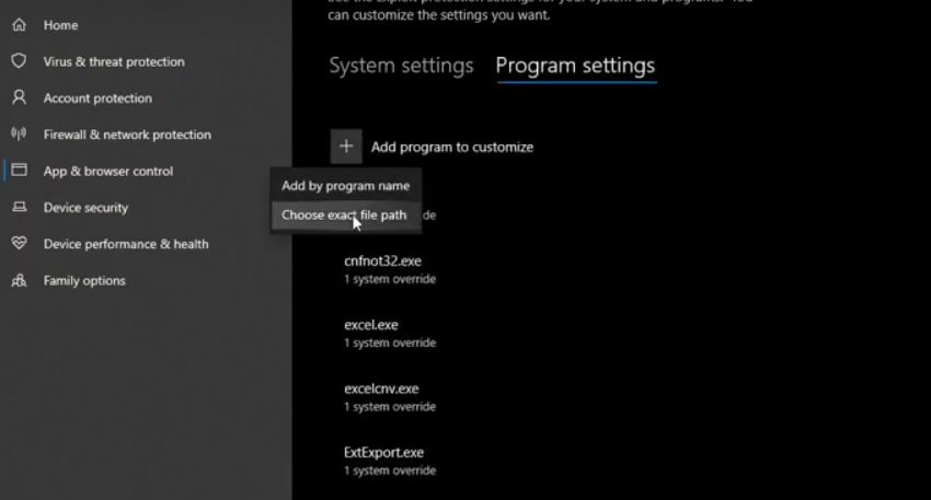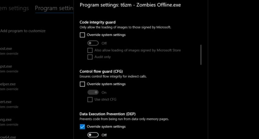 وارد قسمت Exploit protection شوید و به قسمت program setting رفته واز قسمت choos exact file pathحتما exe یعنی t6zm - Zombies Offline.exe رو در پوشه نصب بازی انتخاب کنید