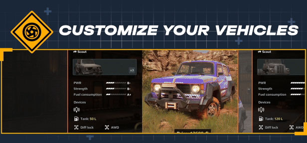 وسایل نقلیهی خود را در گاراژ شخصیسازی کنید و از میان ماشینهای شناسایی سبک، خودروهای آفرود قدرتمند، یا کامیونهای غولپیکر انتخاب کنید. سبک خود را تعیین کنید—کاوش سریع و سبک یا حمل تجهیزات سنگین و آهسته.