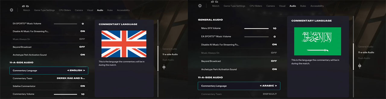 بازی دارای 2 زبان و گزارشگر عربی و انگلیسی می باشد.
